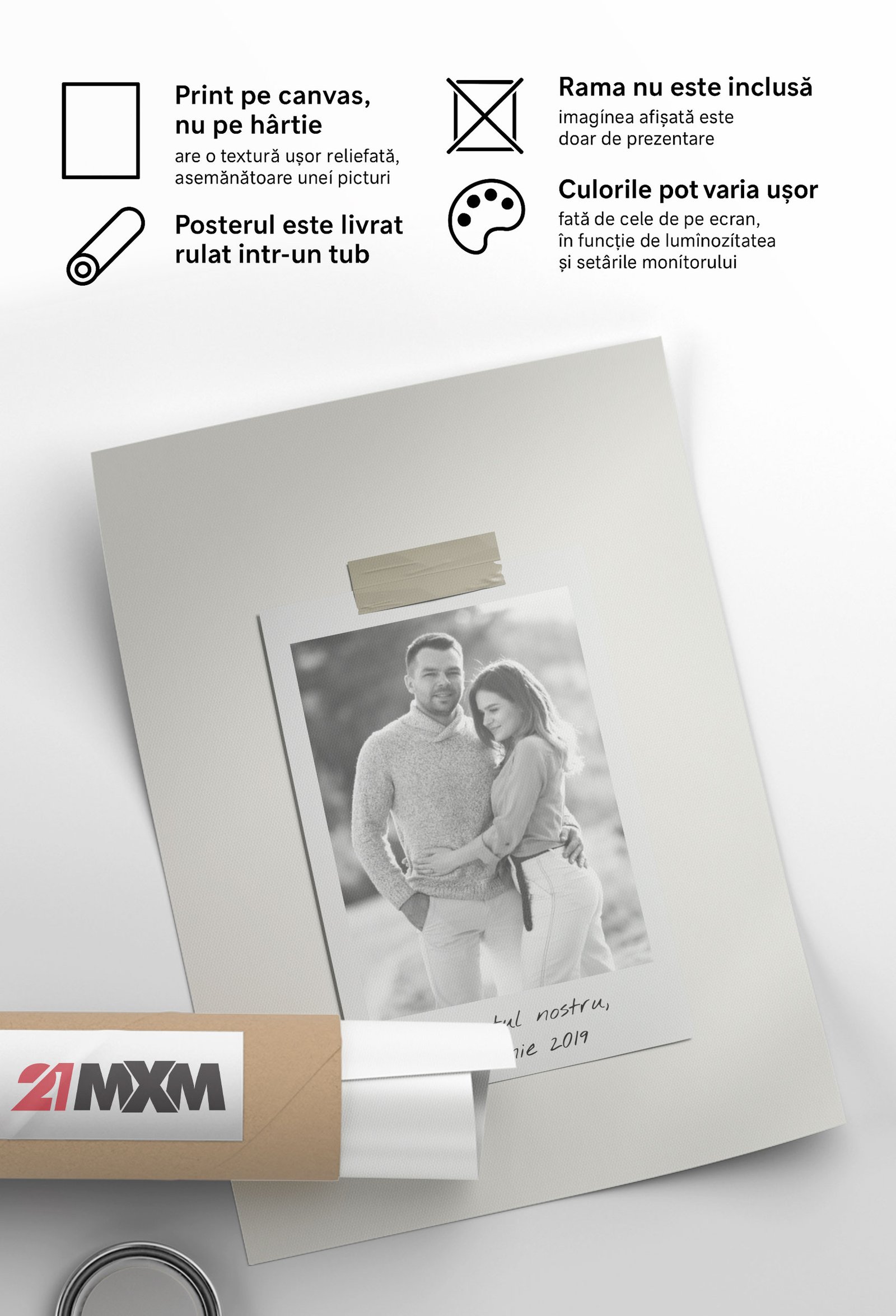 Posterele sunt livrate fără ramă, pentru a-ți oferi libertate totală. Poți alege orice ramă care se potrivește stilului tău și decorului casei tale. Noi îți oferim arta – tu îi oferi contextul final.