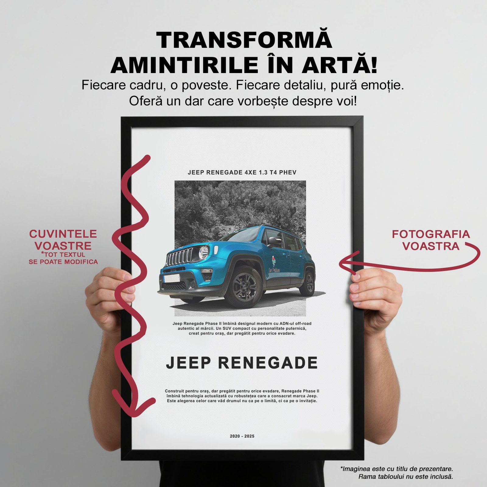 • Completezi direct pe pagină textele pentru personalizare și încarci imaginile dorite. Pentru orice intrebare sau problema, ne poti contacta folosind formularul de aici.